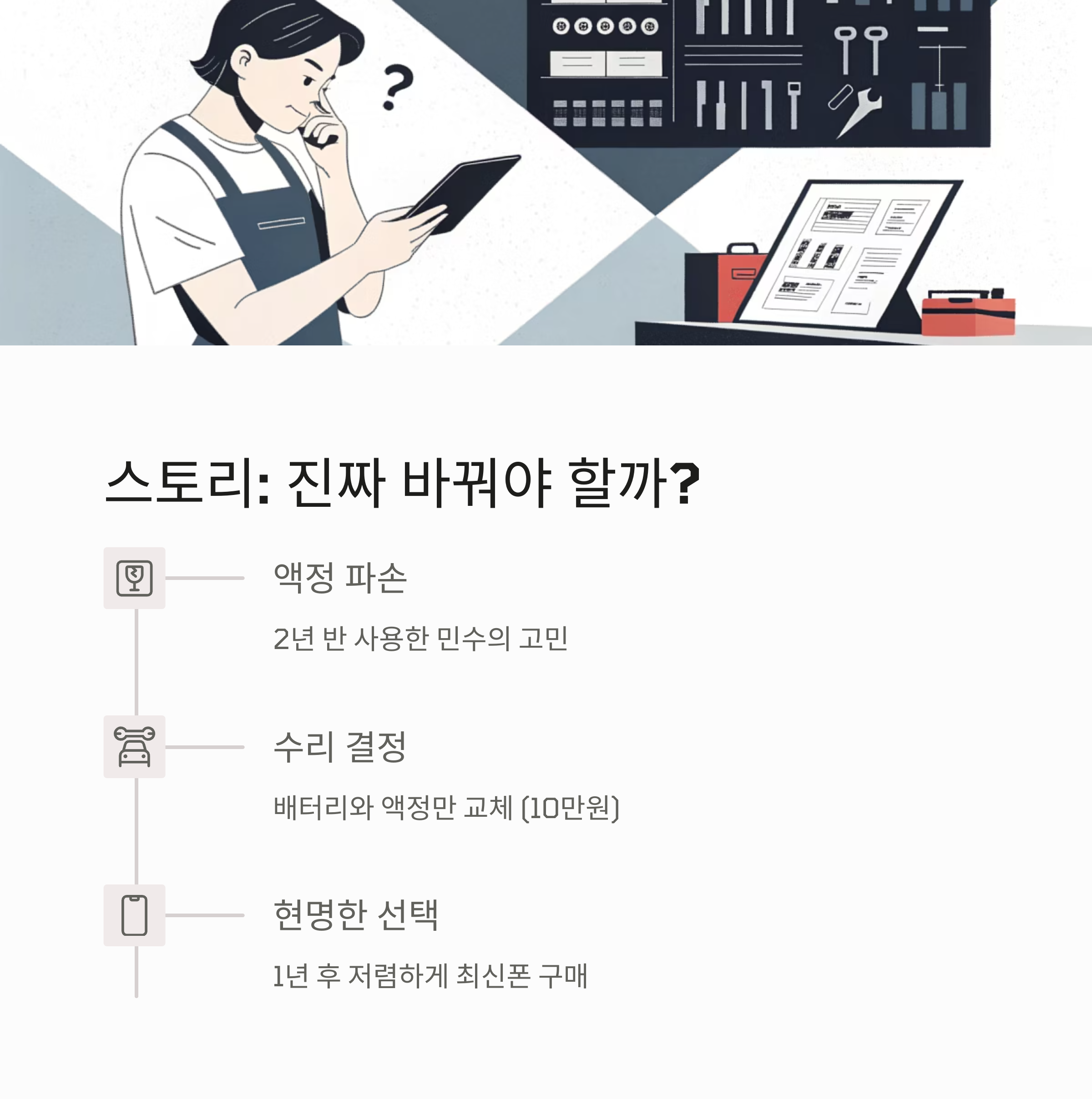 결국 민수 씨는 배터리와 액정만 교체하고 1년을 더 쓰기로 결심했습니다.