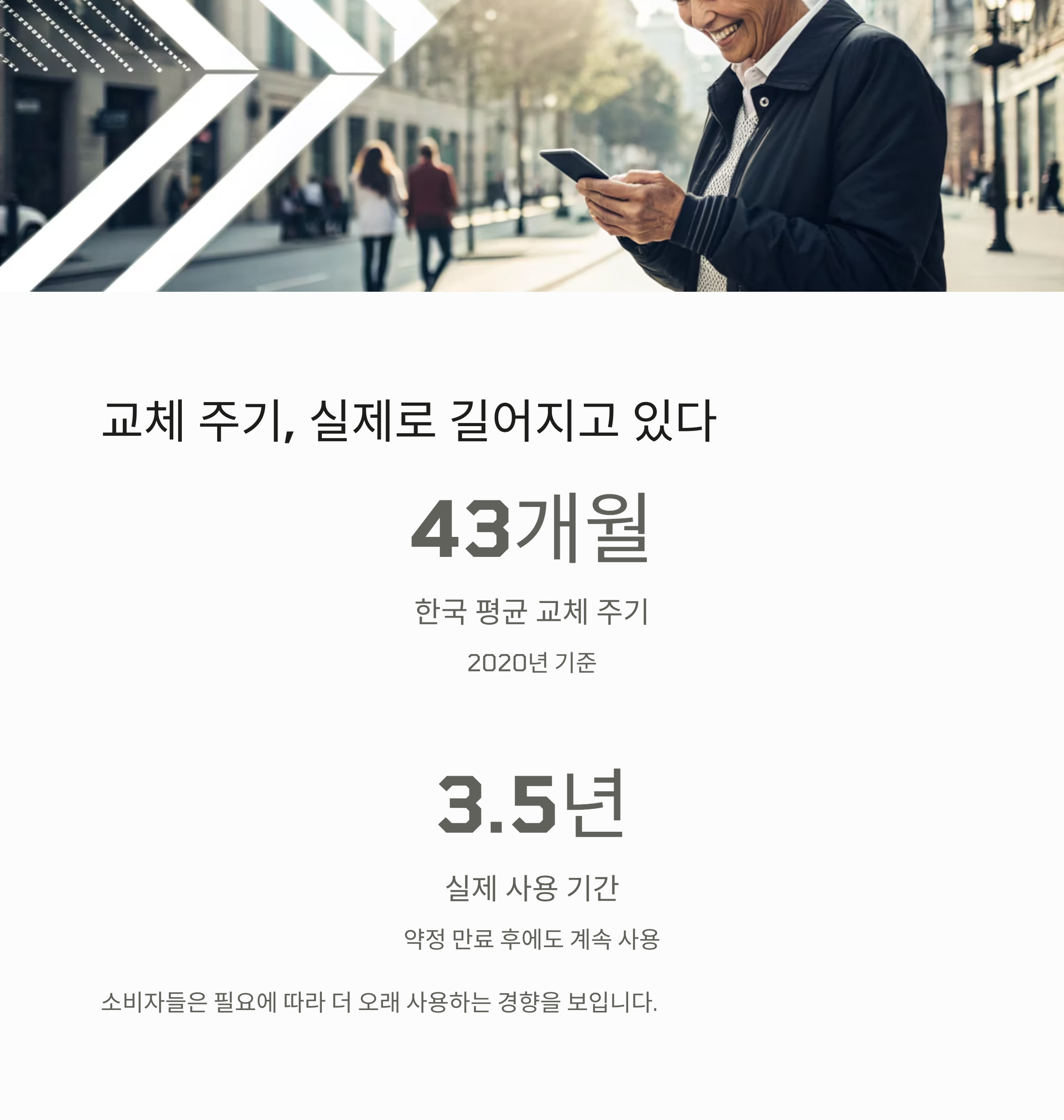 한국의 스마트폰 교체 주기는 **43개월(3.5년)**로 확인된 바 있습니다.